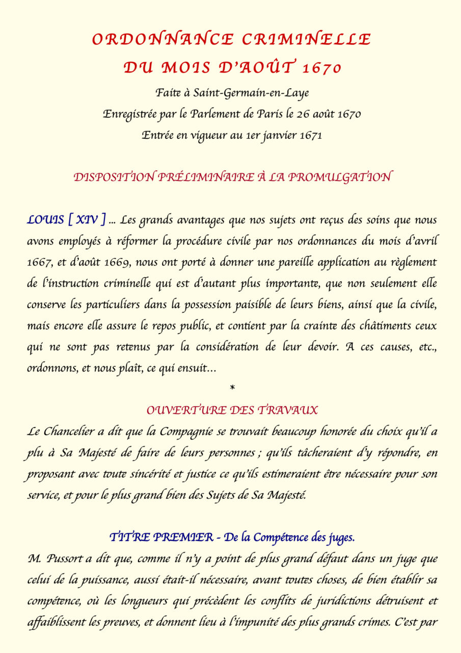 Voulue par Louis XIV, cette Grande ordonnance est l’un des premiers textes français reprenant de nombreuses règles de procédure pénale. Elle reste en vigueur jusqu’à la Révolution française et est abrogée par décret par l’Assemblée constituante le 9 octobre 1789.
