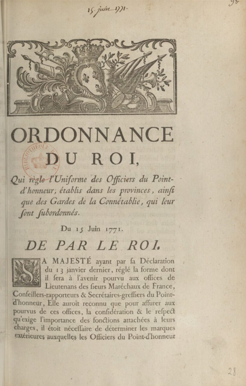 Ordonnance du Roi qui règle l’uniforme des Officiers du Point-d’Honneur, établis dans les provinces, ainsi que des Gardes de la Connétablie, qui leur sont subordonnés (source BNF/Gallica)